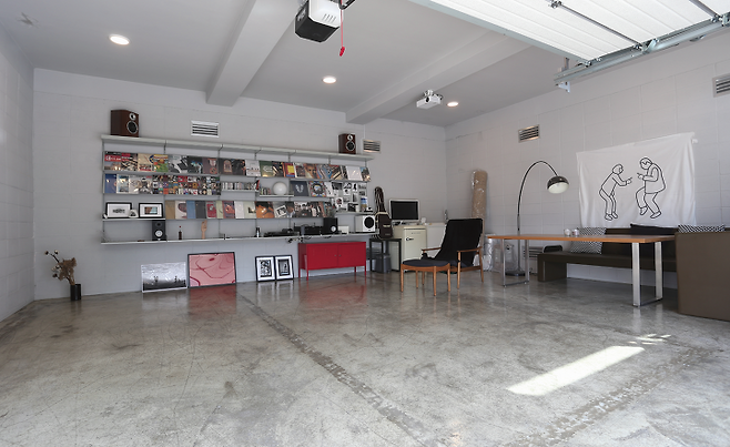 지하 2층 차고는 엔터테인먼트 공간으로 오디오와 빔 프로젝터를 설치하고, 오래된 LP판으로 한 벽면을 장식했다. 지인이나 가족이 방문할 경우, 이 공간은 영화 보거나 음악을 감상하고, 노래를 부르며 즐길 수 있는 파티 장소가 된다.