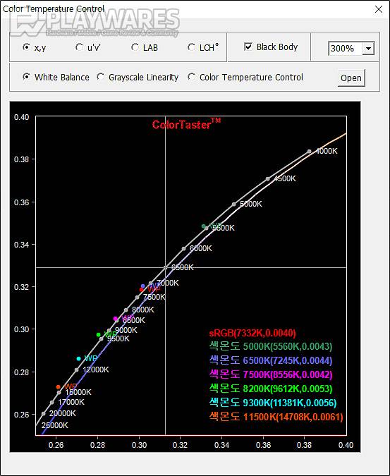절대온도(K) 수치로 특성을 나타내는 색 온도는 5000K-11500K 사이 총 6가지 모드 선택이 가능하고 대체적으로 모드명으로 표기된 색 온도보다 500-600K 정도 값이 높은 색 온도 환경을 지원하고 있습니다. 기본 설정인 6500K 모드 역시 실제 색 온도는 7200K 수준으로 표준 색 온도(6500K)에 비해선 푸른(Blusih) 느낌이 조금 더해져 있는 상태라 보시면 되겠는데 이 부분만 감안할 수 있다면 상대적으로 붉은(Reddish) 느낌이 강한 색 온도에서 표준에 가까운 색 온도, 푸른 느낌이 강해지는 색 온도 설정이 가능하니 취향이나 선택지 측면에서는 메리트가 있는 구조라 하겠습니다. 전용 SmartImage의 경우 대부분의 색 온도가 기본 색 온도 설정을 따라가지만, 영화와 게임 모드에 한해서 8400-8800K 수준으로 높은 색 온도가 지정되며 상대적으로 푸른 느낌을 강하게 만드는 특징이 있으니 참고해 두시면 좋습니다.