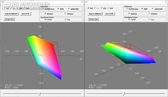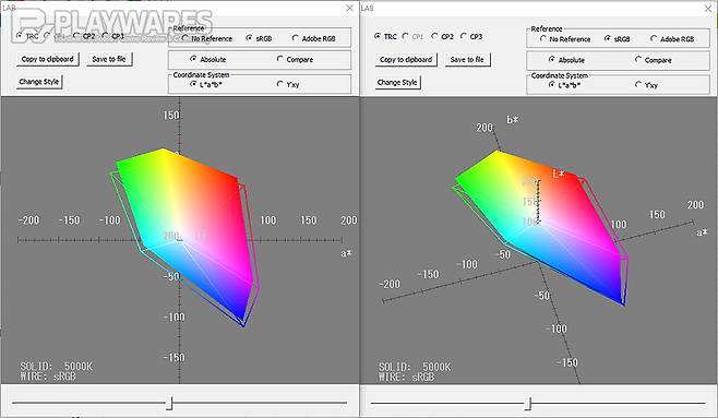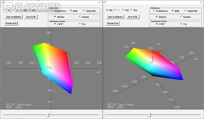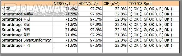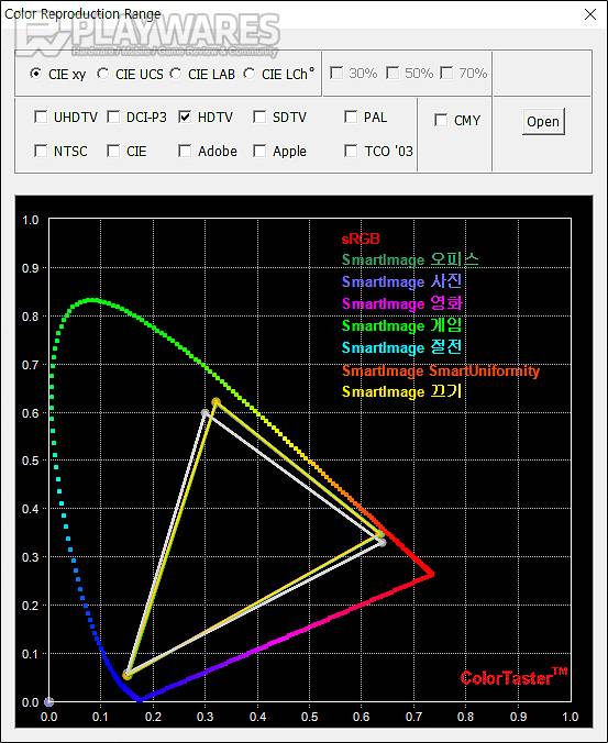 색상은 국제 산업 표준의 하나이자 가장 보편적인 색상 표준이라 할 수 있는 sRGB를 기준으로 하고 있습니다. 수치상의 커버리지는 sRGB 97-98% 수준, 해당 기준을 온전히 만족시킬 수 있는 수준은 아니지만 전문 작업용이 아닌 일반 콘텐츠 소비 및 라이트한 작업 환경 목적에서는 무난하게 쓰여질 수 있는 표현력을 갖춘 상태라 할 수 있겠습니다. 색상 영역은 전용 SmartImage보다 색온도 모드를 변화시킬 때 비교적 큰 변화가 있고 푸른 느낌이 강한 색 온도 또는 붉은 느낌이 강한 색 온도 특성에 맞춰 색상 영역이 늘어나거나 감소하는 식의 차이를 나타내고 있으니 참고해 두시면 좋겠습니다.