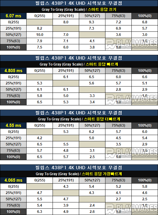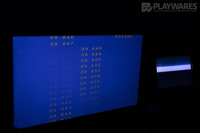 색상 전환, 잔상 특성과 연관되는 응답시간은 OSD의 스마트 응답 메뉴를 활용할 수 있습니다. 기본 끄기 설정부터 제공되는 스마트 응답을 조작하게 되면 끄기 상태에서 확인되는 6ms 초반대 응답시간(GTG 응답시간 기준)이 빠르게, 더빠르게, 가장빠르게 단계에 따라 4ms 후반대에서 최대 4ms 초반대까지 오버드라이브되는 환경을 제공받을 수 있습니다. 다만, 이 제품의 경우 스마트 응답 더빠르게 단계부터 빠르게 움직이는 이미지에서 고스팅(역잔상) 현상이 체감될 확률이 높아지기 때문에 이에 민감한 경우라면 기본 끄기를 유지하거나 빠르게 모드를 최대치로 고려해 두는 것도 방법이겠습니다. 끄기 모드 기준에서의 응답시간도 준수한 편에 속하기 때문에 콘텐츠 감상 및 게임 등의 환경에 무난하게 쓰여질 수 있는 수준이라 생각됩니다. (데이터는 플레이웨어즈 테스트 환경 기준이며 테스트 환경이나 방식에 따라 어느정도의 편차는 존재하겠습니다. 잔상이나 역잔상을 체감하는 부분 역시 개인차가 존재하는 영역이므로 해당 사항을 참고해 주시기 바랍니다.)