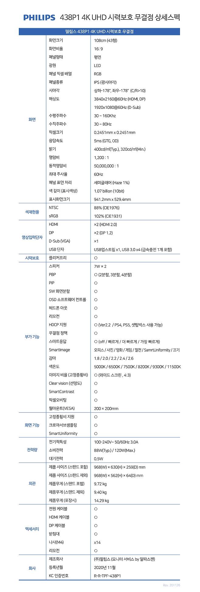 최근 모니터 시장의 트랜드 중 하나를 꼽자면 대화면 디스플레이가 있겠습니다. 그와 관련해 소개해드릴 수 있는 제품 필립스 438P1 4K UHD 시력보호 무결점은 43인치 IPS 광시야각 디스플레이를 탑재하였고 더불어 4K UHD(Ultra-HD, 3840x2160) 고해상도 설정을 지원하는 대화면 모니터인데요. TV에 준하는 수준으로 넓은 디스플레이를 갖는 상태에서 대중적인 FHD 해상도 또는 그보다 높은 QHD 해상도보다 높은 해상도를 지원하고 있어 고화질 이미지 및 영상 콘텐츠 감상 등이 가능하게 만든 특징이 대표적입니다. 뿐만 아니라 NTSC 88% 색상 표현력을 스펙 일부로 갖추었고 시력보호를 위한 플리커프리(Flikcer-Free) 디스플레이, SmartImage 최적화 모드 지원 및 MultiView 분할 화면 모드, 전용 소프트웨어 SmartControl(SmartDesktop) 지원과 같은 다양한 옵션 활용도 가능하게 만든 제품이므로 다용도 목적에 어울릴 43인치 UHD 모니터로 주목해 보셔도 좋습니다.