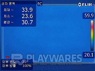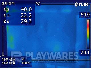 이미지는 화면을 켠 상태에서 에이징을 진행하고, FLIR사의 E시리즈로 본체 발열을 측정한 결과입니다. 본체의 평균 발열은 전후면 29-31˚C 사이, 발열이 집중된 부위는 주로 본체 뒷면 일부로 33˚C에서 최대 40˚C 수준의 발열 상태를 보여주고 있습니다. (플레이웨어즈 테스트 기준 / 오차 범위 존재) 발열 정도를 나타내는 수치는 측정 환경이나 방식, 기타 여러 요인에 따라 차이가 발생할 수 있으니 참고바랍니다.
