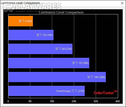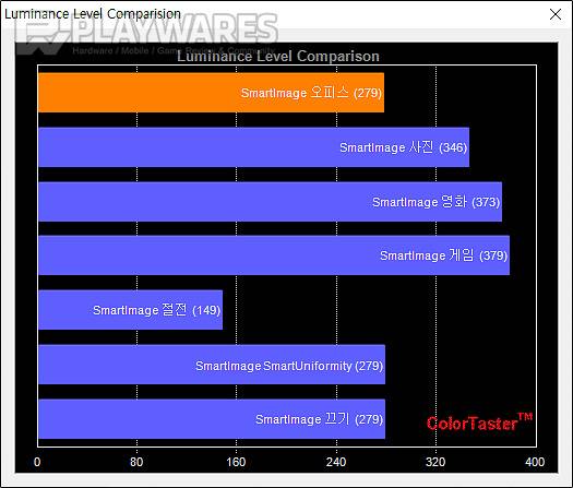 화면의 밝은 정도를 나타내는 휘도는 초기 설정 OSD 밝기 70을 기준으로 279nit, 가장 높은 밝기 100 기준에서는 356-379(SmartImage 게임) 수준으로 휘도 향상이 이루어지고 있습니다. 밝기 단계를 직접 조절하는 경우가 아니더라도 전용 SmartImage 모드에 담긴 프리셋을 활용해 콘텐츠 감상용 고휘도(사진, 영화, 게임)나 문서 작업용 저휘도(오피스) 혹은 저전력(절전) 휘도 최적화도 가능한 특징이 있으니 참고해 두시면 도움이 될 수 있겠습니다.