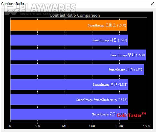디스플레이는 IPS 액정 방식을 채택한 제품입니다. 0.15-0.23nit 사이의 저휘도 블랙(Black) 색상 표현력 그리고 전용 SmartImage 모드 선택에 따라 적게는 1300:1 많게는 1600:1에 가까운 고대비 명암 환경을 연출할 수 있는 게 특징인데요, 수치상의 차이는 어느정도 존재하지만 대체적으로 다양한 콘텐츠 활용에 두루 효과적일 암부 표현력을 제공한다 할 수 있겠습니다. 단일 샘플 제품에서 얻어낸 결과이므로 오차 범위를 감안해야 하며, 그 외 화면 균일도나 빛샘 관련 특징 역시 동일 제품에서도 출고 상태에 따라 일부 차이가 발생할 수 있습니다.
