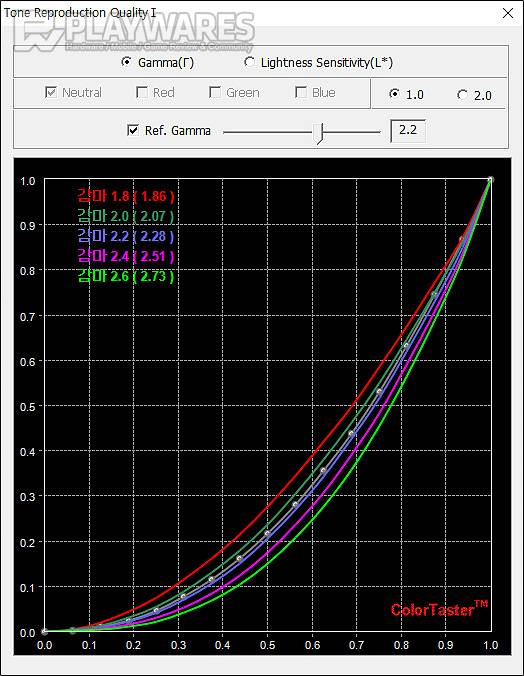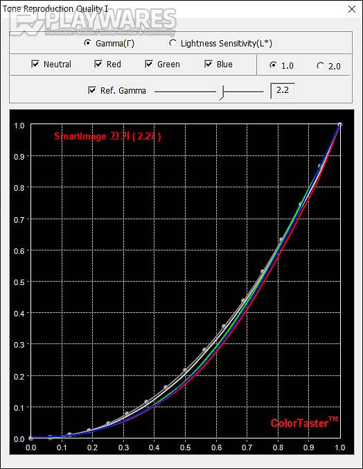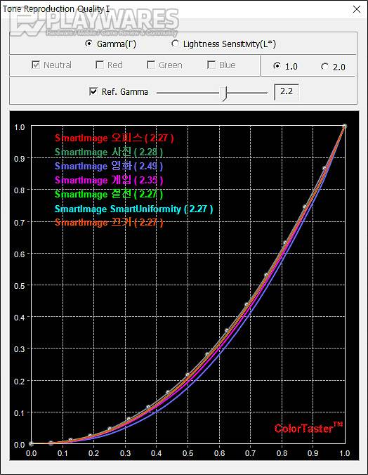 밝기 톤에 영향을 주는 감마는 5가지 감마 메뉴 선택이 가능하고, 표준 감마 2.2에 가장 가깝게 맞추어진 감마 2.2 기본 설정 기준으로 조금 더 화사한 톤 설정을 위해 감마 1.8-2.0 모드를 선택하거나 반대로 진한 톤 설정을 위해 감마 2.4-2.6 모드 설정을 각각 다르게 할 수 있는 옵션 구성이 제공됩니다. 전용 SmartImage로 제공되는 여러 모드들은 감마 메뉴 조작을 따라가게 됩니다.