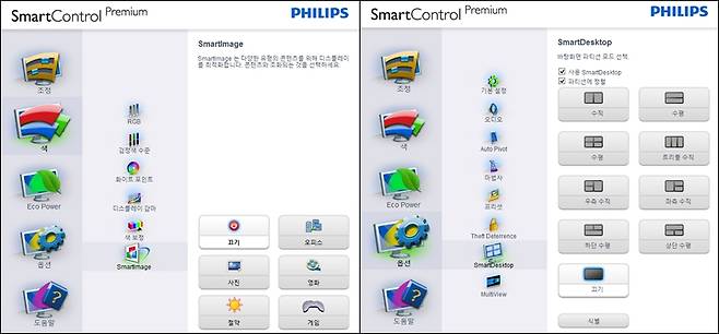 - 전용 SmartImage의 주 효과는 화면 밝기, 색 온도 변화이므로 톤 변화는 별도 감마 메뉴를 통해서만 가능한 점