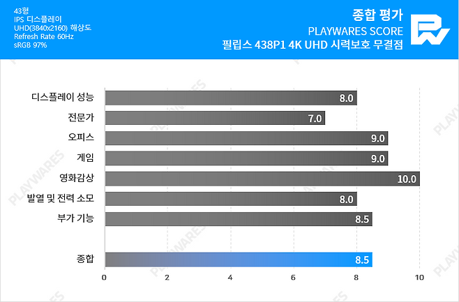 디스플레이 옵션 측면에서도 필립스 438P1 4K UHD 시력보호 무결점은 광시야각 IPS 기반(10bit 컬러, 8bit+FRC 참고) 전문 작업을 제외한 다용도 목적에 두루 쓰여질 수 있는 sRGB 색상 환경을 지원하고 있습니다. 정교함을 따지는 경우에는 몇몇 체크해 두어야 할 부분이 있지만 제품 자체가 전문 용도보다는 엔터테인먼트용 모니터 컨셉을 갖고 있다는 점에서 대화면, 고해상도 디스플레이를 기반으로 한 단순 문서, 웹 서핑, 영화 감상, 게임을 즐기는 것 무난하게 쓰여질 제품으로 보여집니다. 특히 전용 SmartImage의 최적화 모드(오피스, 사진, 영화, 게임 등...) 설정 및 감마, 색온도와 같은 옵션 선택지를 더할 수 있고 주로 화면 밝기와 색 온도 특성을 크게 변화시켜줄 수 있는 특징이 있으니 동일한 콘텐츠를 서로 다른 느낌으로 감상할 수 있게도 만들어주는 부분도 참고를 해두면 좋고 또한 전용 소프트웨어 SmartControl을 통한 OSD 조작 및 분할 화면 환경을 연출할 수 있다는 점도 활용도를 높여주는 좋은 요소라 할 수 있겠습니다.