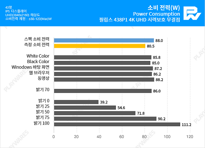 OSD 밝기 단계 70을 기본 설정으로 제공하는 환경에서 전력 소모는 평균 80W 초반대로 확인됩니다. (플레이웨어즈 테스트 기준, 오차 범위 참고) 밝기 단계 100 기준에서 제품 내 가장 높은 111W 수준 전력 소모 상태가 확인되고 그 외 대부분의 환경에서는 스펙으로 표기된 88W에 준하거나 그 이하의 전력 소모 상태를 보여주고 있습니다. 필요하다면 밝기 단계를 조절해 70W이하, 최대 30W대 수준까지 전력 소모 상태를 낮춰줄 수 있으니 변화폭을 참고해 두는 것도 방법이겠습니다. (측정 방식이나 환경에 따라 차이가 발생할 수 있는 점 참고바랍니다.)