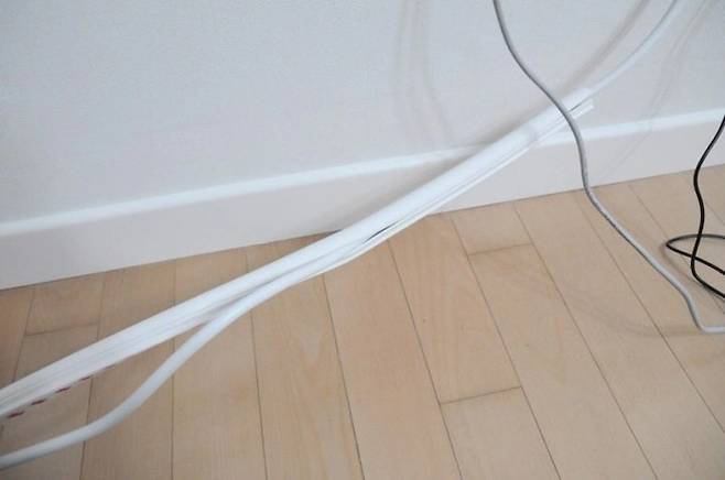 원하는 길이만큼 전선 몰딩을 자른 다음에, 몰딩 틈새로 전선을 안쪽으로 밀어 넣어 주세요.