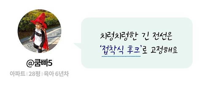 참고로 후크를 선택할 때 한 가지 주의할 점은 케이블 선의 두께와 감기는 횟수를 계산하고 후크 고리 사이즈를 선택하셔야 한다는 점이에요. 너무 작은 것으로 선택해서 붙였다가는 전선이 다 감기지도 못해서 정리도 안 되고, 붙이나 마나 하는 정도가 될 수도 있답니다.