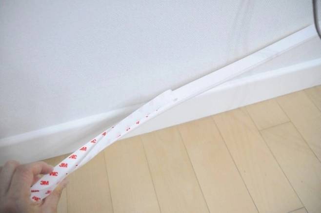 그 다음 전선몰딩 뒤쪽에 있는 3M 테이프의 이형지를 떼어낸 후, 원하는 위치에 붙이면 끝!