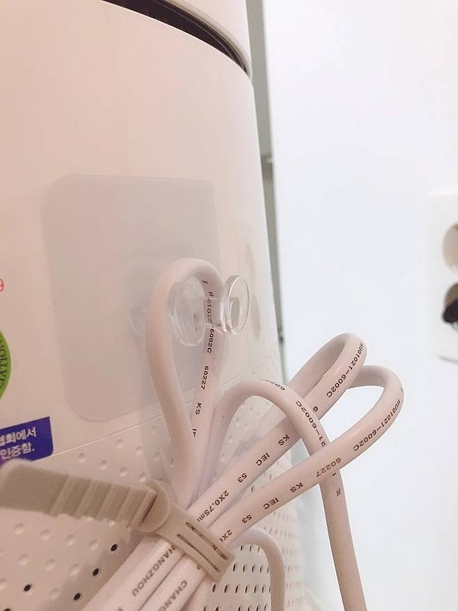 휴대폰 충전기처럼 얇은 선이라면 작은 사이즈도 괜찮지만, 이렇게 좀 두꺼운 선이라면 큰 사이즈로 사시는 걸 추천해요.