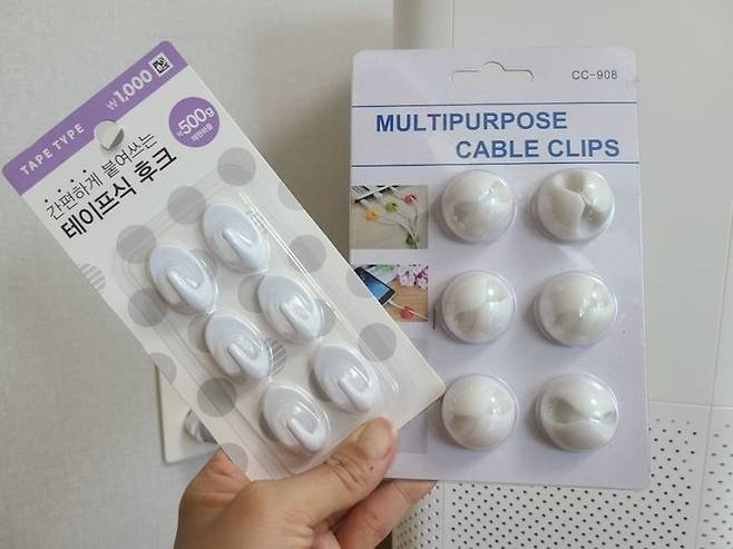 준비물은 다 파는 가게나 온라인 몰에서 쉽게 구할 수 있는 테이프식 후크와 케이블 클립이랍니다.