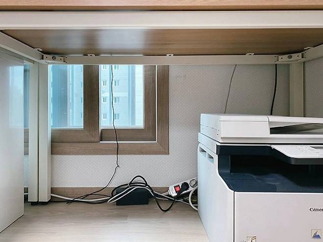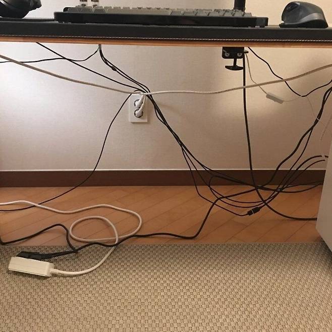 고개를 한껏 숙여 아래에서 바라봐야만 숨겨진 선들을 발견할 수 있어요. 컴퓨터 선 정리에 활용해보세요!
