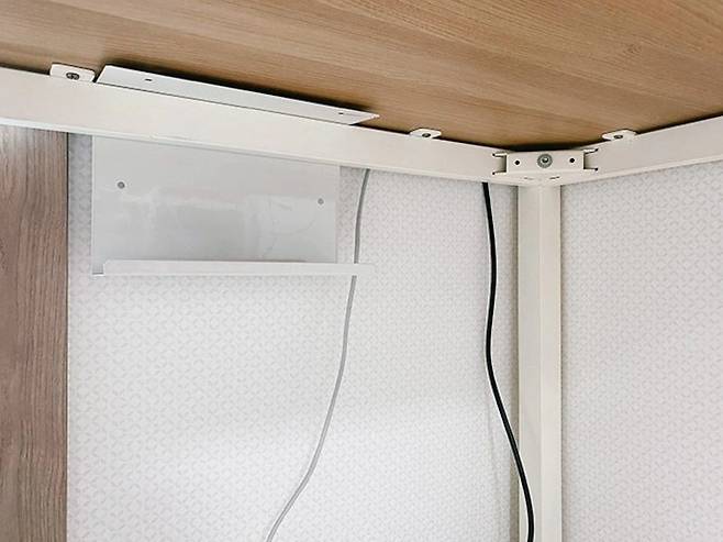 이 ㄷ자형 멀티탭 거치대를 이렇게 책상 아래에 끼워주세요. 저는 책상 프레임 사이의 틈에다 끼웠더니 고정이 잘 됐어요.