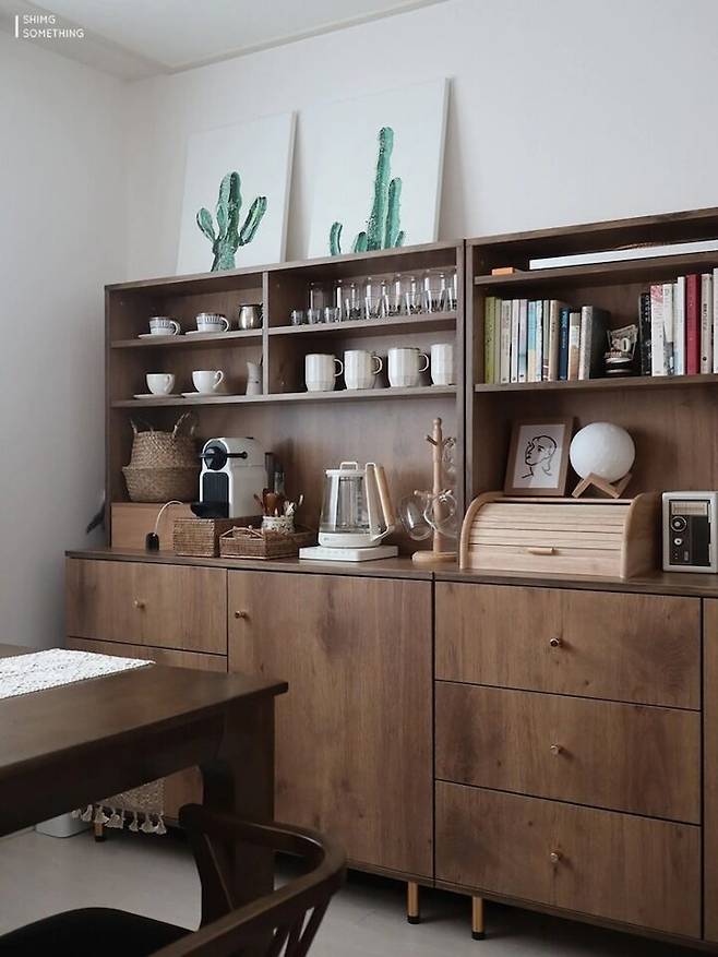 우드 컨셉으로 꾸민 홈카페 분위기에 맞춰 멀티탭 정리함도 우드로 통일했더니 눈에 거슬리지 않아 더욱 마음에 들어요.