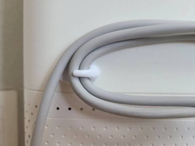 전선을 감을 수 있는 적당한 위치를 잡은 다음, 후크를 바깥 방향쪽으로 붙여줍니다.