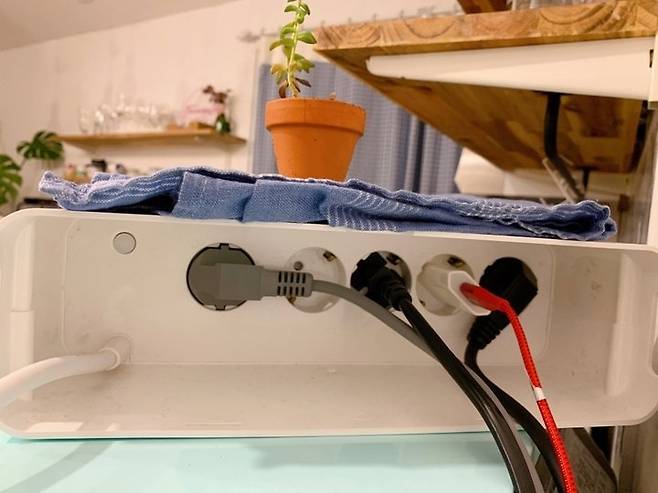 다른 멀티탭과 다른 점은 박스형이라 콘센트가 후면에 위치해 있어, 선을 외부로 보이지 않게 정리해 둘 수 있다는 것이에요. 이렇게 안쪽에 있는 콘센트에 연결만 해주면 끝!