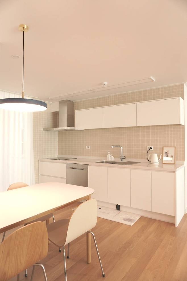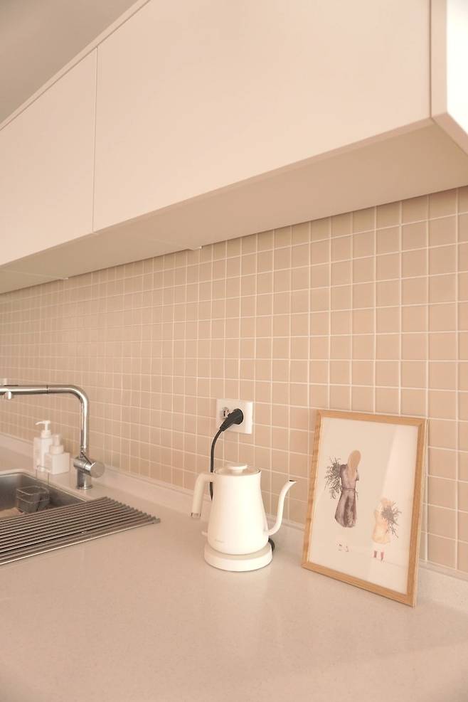 확장을 할까, 구조를 어떻게 할까 고민을 참 많이 했던 주방인데요. 고객님과 충분한 상의 끝에 일자형 주방에 부족한 수납은 베란다에 해결하기로 결정. 비스포크와 식세기는 무조건 원하셨기 때문에 최종적으로 완성된 주방 모습입니다.