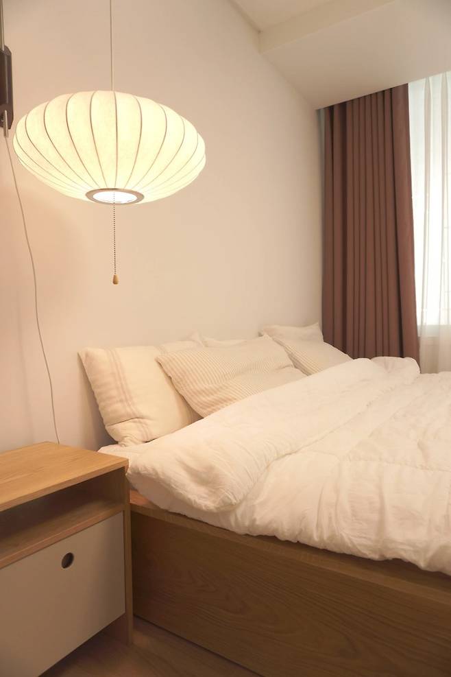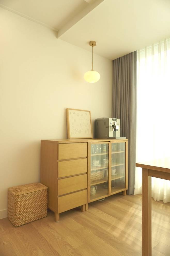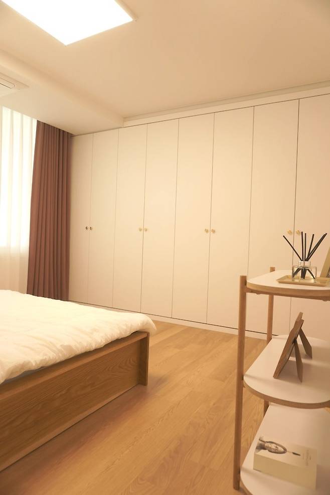 안방도 전에 스타일링 받으실 때 오크 원목의 좋은 제품을 구매하셨었기 때문에 전체적으로 집 분위기에 어울리는 페브릭과 소품만 초이스 해드렸습니다. 붙박이와 화장대로 사용하시는 서랍장은 새로 제작해서 들어갔어요.