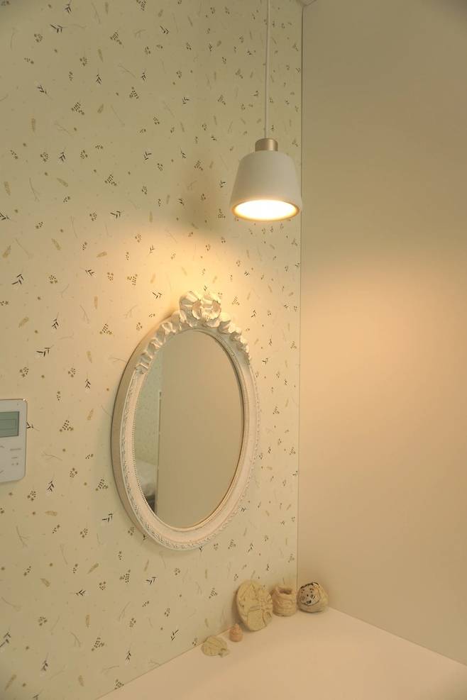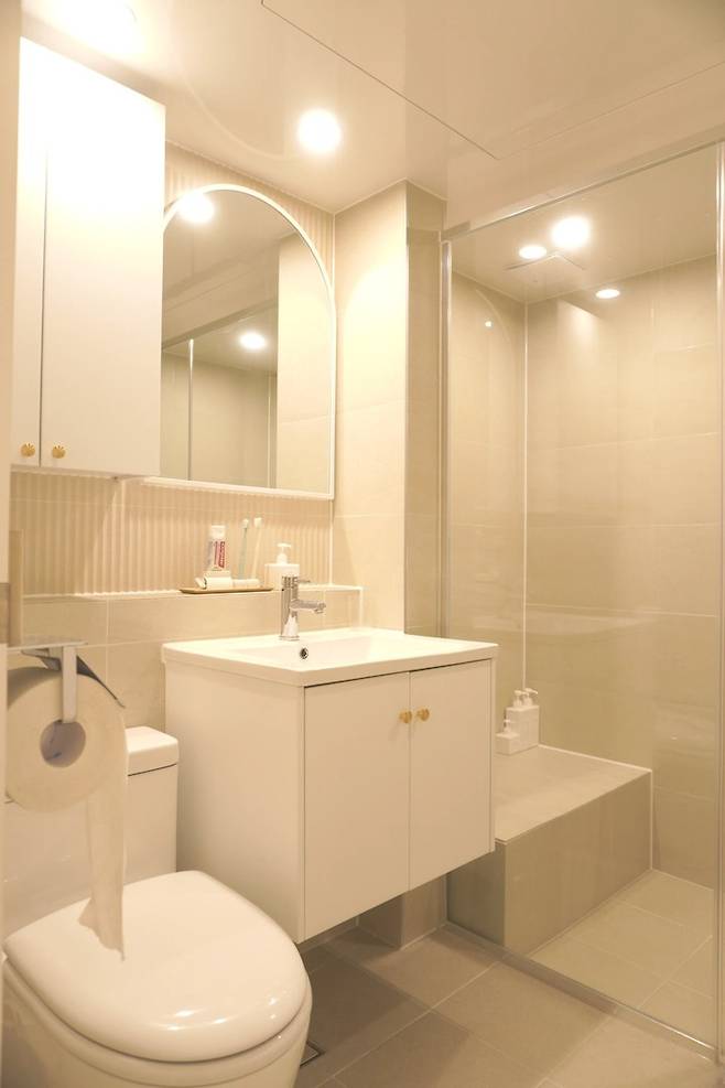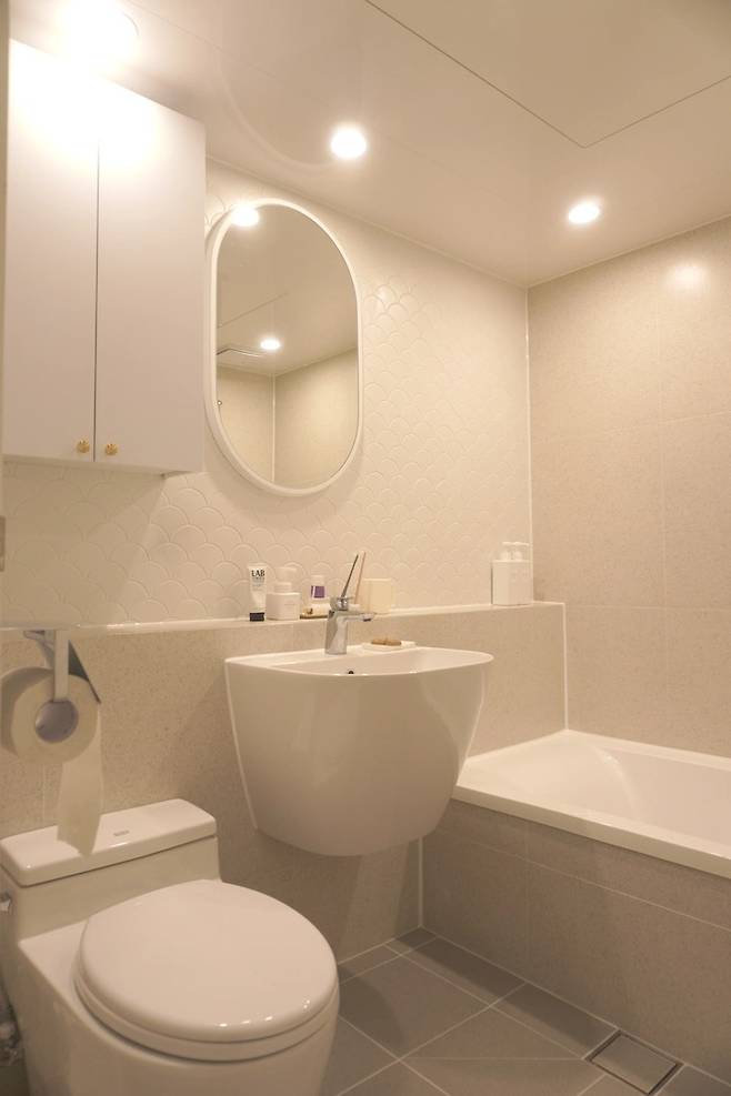 욕실은 600각 연그레이 테라조 타일과 젠다이 윗 부분에만 은행잎 모양의 화이트 모자이크 타일을 믹스했어요. 오래 사용하셔도 질리지 않는 스타일로 깔끔하게 추천드렸습니다.