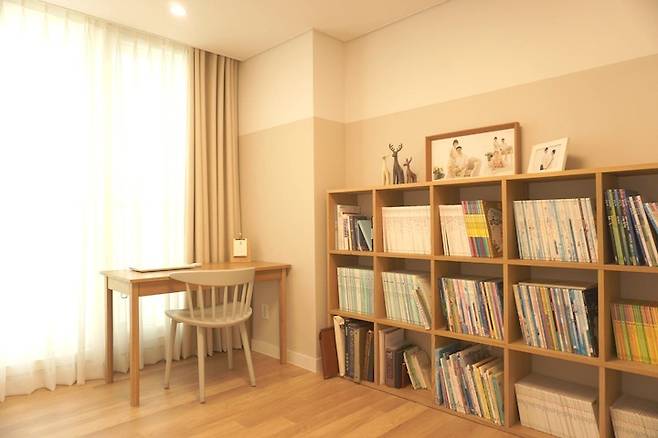 서재에는 기존에는 거실에서 사용하시던 원목 책장과 책상을 두고 새로 구매하신 디지털 피아노와 작은 붙박이장이 배치되었습니다. 사용하시던 책장은 한단 더 추가 구매하여 수납력이 더 좋아졌어요.