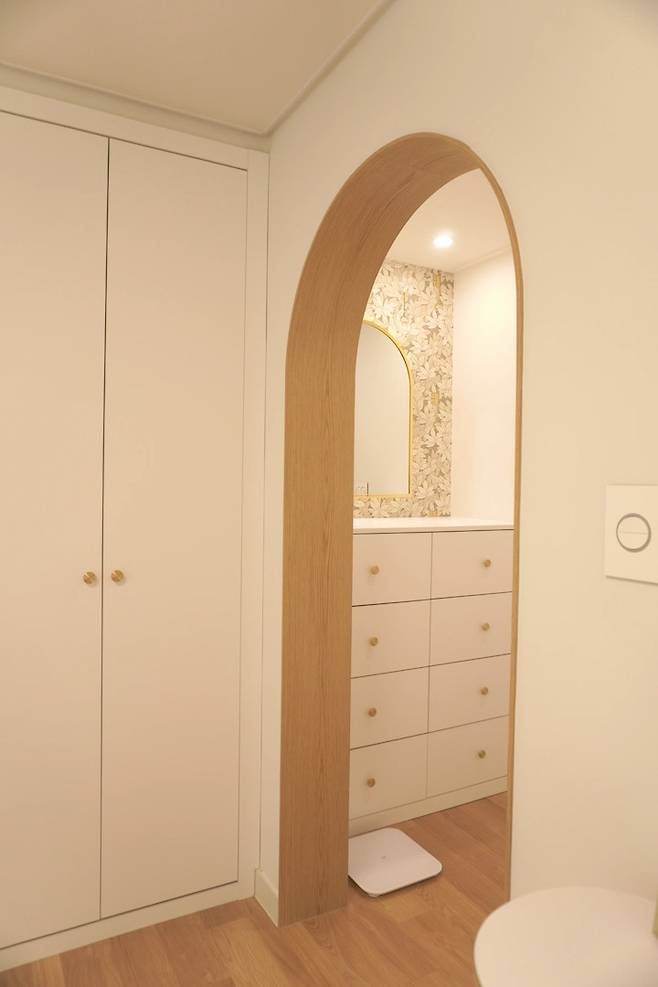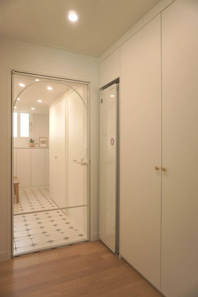 패턴 타일과 화이트 아치 중문이 포인트가 되어주는 현관입니다. 전실까지 이어진 넓은 현관에는 캠핑을 즐기는 가족들을 위한 펜트리를 만들었어요. 중문 안쪽으로는 스타일러와 청소기 등을 넣을 수 있는 수납장도 제작했습니다.