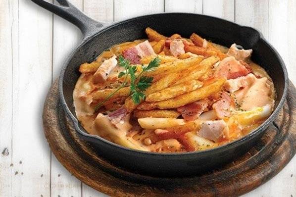 그릇 가득 채워진 뜨거운 치즈가 늘어나는 모습이 일품인 퐁듀떡볶이. 감자튀김과 베이컨을 얹어 일견 떡볶이라고는 생각할 수 없는 비주얼이지만, 치즈 속에 감춰진 떡볶이를 집어 따끈한 치즈와 베이컨 등과 함께 먹으면 그 맛이 일품이다. 특히 고소한 치즈 맛을 사랑하는 여자들에게 인기가 높은 메뉴다.