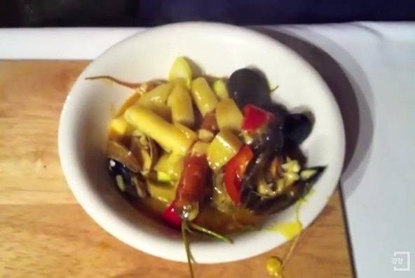 작은 게 튀김이나 오징어, 조개 등 다양한 해산물 재료가 듬뿍 들어가 시원한 국물 맛을 더해주는 해물떡볶이. 어묵이나 만두, 튀김 등을 곁들여 먹는 일반적인 떡볶이와는 달리 푸짐한 해산물로 짬뽕 같은 비주얼과 향을 보여준다.