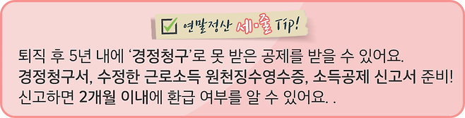 중도 퇴직자의 연말정산, 경정청구, 전 직장의 원천징수영수증을 발급받는 방법까지 알아봤습니다. 전 직장에서 연말정산 시 누락된 공제 항목은 경정청구를 통해 환급 요청할 수 있다는 것! 잊지 마시고, 퇴직 후 못한 연말정산 마무리하시길 바랍니다.