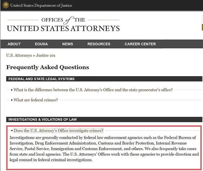 미국 연방검찰청 FAQ 코너에 '연방검찰청이 범죄 (직접) 수사를 하냐'는 질문이 있는 것을 볼 때 미국에서도 검사의 직접 수사 문제에 대한 관심이 적지는 않은 듯 싶습니다. 그리고 이 질문에 대한 답에서 미국 연방검찰청은 "통상적으로" 연방검찰청이 아닌 FBI 등 다른 법 집행기관이 수행한다고 밝힌 대목만 읽으면, 미국 검사는 (직접) 수사를 하지 않고, FBI 같은 사법경찰 기관의 '수사'와 연방검사의 '기소'가 분리되어 있는 것처럼 느낄 수 있습니다.
