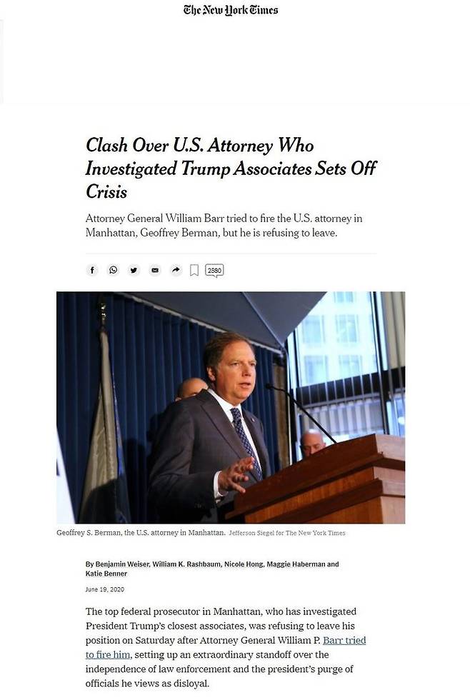 | [트럼프의 측근들을 "수사"한 연방검사(U.S. Attorney)를 놓고 벌어진 충돌이 위기를 유발하다.] - 법무부 장관 윌리엄 바가 맨해튼에 있는 연방검사(U.S. attoney)인 제프리 버만을 파면하려고 시도했지만, 버만이 물러나기를 거부하고 있다. 2020년 6월 19일 / 뉴욕타임스 트럼프 대통령의 최측근들을 수사해온 맨해튼의 최고위 연방 검사(federal prosecutor)가 토요일에 법무부 장관 윌리엄 P. 바가 파면하려고 시도한 이후에도 자리에서 물러나기를 거부함으로써, 법 집행의 독립성과 불충하다고 여겨지는 공무원들에 대한 대통령의 숙청작업 사이의 이례적인 교착상태를 일으키고 있다. [Clash Over U.S. Attorney Who Investigated Trump Associates Sets Off Crisis] - Attorney General William Barr tried to fire the U.S. attorney in Manhattan, Geoffrey Berman, but he is refusing to leave. June 19, 2020 / The New York Times The top federal prosecutor in Manhattan, who has investigated President Trump's closest associates, was refusing to leave his position on Saturday after Attorney General William P. Barr tried to fire him, setting up an extraordinary standoff over the independence of law enforcement and the president's purge of officials he views as disloyal. |