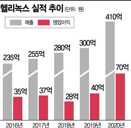 헬리녹스의 매출액은 창업 초기부터 매년 7~9%의 증가율을 이어오다 지난해 코로나19 사태로 캠핑이 인기를 끌면서 급격한 성장세를 보였다. 지난해 헬리녹스의 매출액은 410억원으로 전년 대비 26% 증가했다. 영업이익은 70억원으로, 매출액 대비 이익률이 17%에 달했다. 2014년만 하더라도 매출액과 영업이익이 62억원, 6억원에 불과했다.