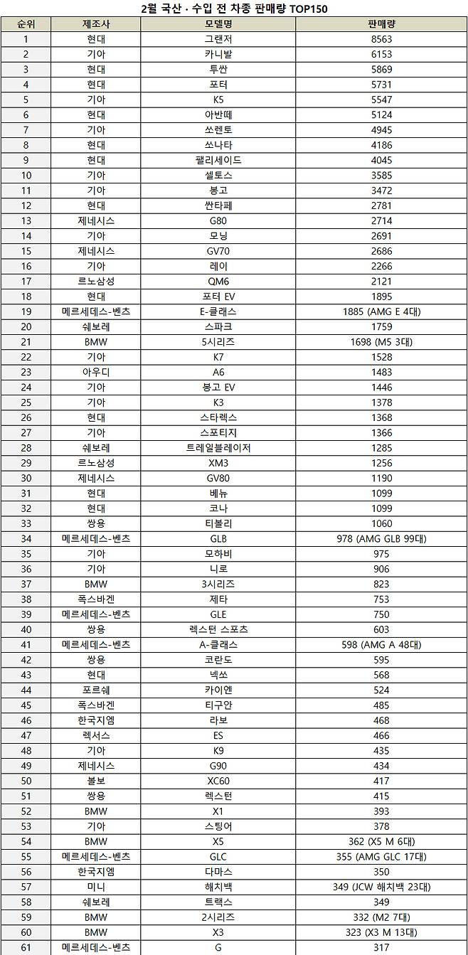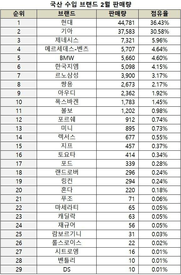 2021년 2월 국산차와 수입차 판매량을 정리했다. 2월은 현대 기아, 메르세데스-벤츠와 BMW의 점유율이 상승했다. 국산차는 현대 기아차가, 수입차는 벤츠 BMW로 쏠림 현상이 더욱 가중되고 있다.