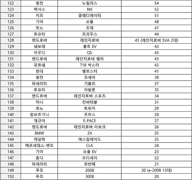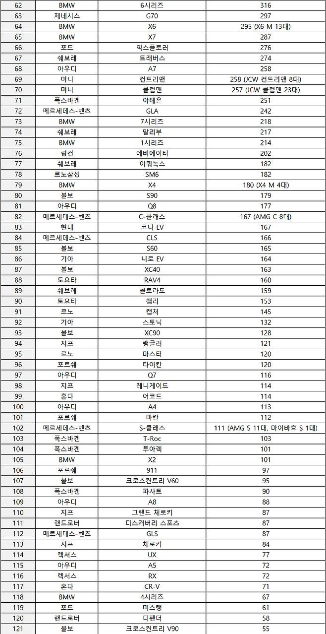 BMW 3시리즈가 폭스바겐 제타보다 높은 인기를 보이고 있다는 점도 특징. 하지만 그보다 포르쉐 카이엔이 폭스바겐 티구안보다 많이 팔렸다는 점이 눈에 띈다. 체급을 비롯해 가격 차이가 크지만 포르쉐의 인기가 어느 정도인지 가늠할 수 있다. 심지어 718은 현대 벨로스터의 판매량을 넘었다.