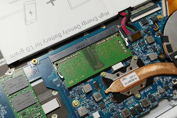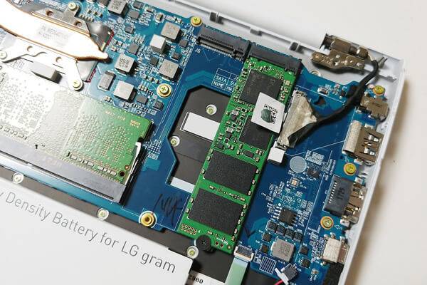 2018년형에서는 램 슬롯 이외에 저장공간도 업그레이드할 수 있는데, M.2 2280 규격의 SSD를 사용하면서 확장 슬롯을 하나 더 두어서 저장공간의 업그레이드까지 가능해졌다. 내부를 보면 M.2 SSD가 하나 설치되어 있고, 그 바로 옆에 빈 슬롯이 하나 있는 것을 확인할 수 있다.