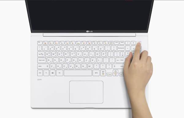 2018년형 그램의 특징 중에서 외형적으로 확인할 수 있는 가장 큰 변화 중 하나는 바로 전원 버튼이다. 이전 모델에서 전원 버튼은 잘못 눌리는 경우를 방지하기 위해 다른 키와는 달리 돌출되지 않고 높이가 낮게 되어있던 점을 빼면 별다른 점을 찾아볼 수 없었다. 하지만 2018년형 그램의 전원 버튼은 이전처럼 납작하기도 하지만 금속성의 원형 링이 가운데 삽입된 형태로 바뀌었다. 왜 이렇게 달라졌을까? 바로 지문인식 센서를 전원 버튼에 내장시킨 것이다.