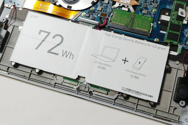 앞서 설명한 바와 같이 2018년형 그램은 배터리 용량이 더욱 높아졌다. 15.6인치 모델 기준으로 2017년형은 최대 22.5시간 사용이 가능했는데, 2018년형은 27.5시간 사용할 수 있다. 사용시간뿐만 아니라 충전 속도도 더욱 빨라졌는데, 2017년형이 고속충전으로 1시간 충전 시 10시간 사용할 수 있었던 것에 비해 2018년형 그램은 1시간 충전으로 13시간까지 사용할 수 있게 되었다.