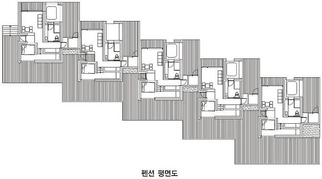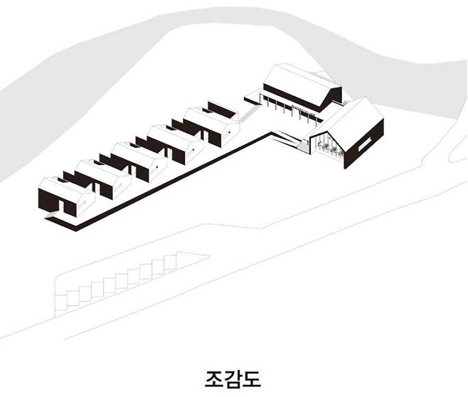 대지가 넓고 국도와 접해있기 때문에 저층으로 분산된 배치가 적합했고, 대지 주변에 흐르는 천변을 최대한 많이 접하는 구조를 생각했다. 또한 펜션은 개별적 프라이버시가 보장되고, 카페와 레스토랑은 외향적으로 드러날 수 있는 형태로 계획했다.
