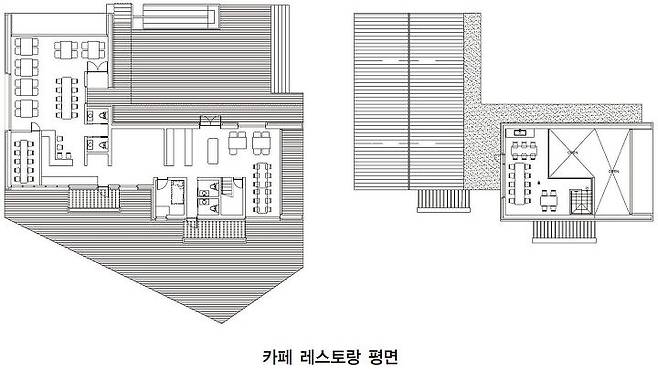 카페와 레스토랑은 비슷하면서도 기능에 맞추어 약간의 변주가 가미된 공간이다. 두 개의 박공지붕으로 배치하고, 카페와 레스토랑이 맞닿은 공간에 주방을 두어 효율성을 생각했다. 카페는 중층으로 구분하고, 레스토랑은 높은 박공지붕이 드러나도록 단층으로 구성했다. 내부 마감은 건축주가 평생 동안 모아온 골동품들을 인테리어 소품으로 사용한다고 해서 최대한 단순하고 공간감이 느껴지도록 구성했다.