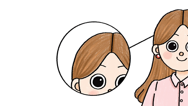 바탕색과 비슷한 한두 가지 색깔로 곡선을 여러 개 그려 머릿결을 표현해주세요. 귀 뒤로 넘긴 부분과 정수리는 어둡게 칠해주세요. 자연스럽게 머릿결의 굴곡을 표현할 수 있습니다.