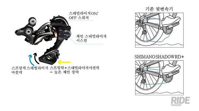 시마노의 MTB 뒷변속기에 이미 적용되어 있는 이 기술은 노면의 충격으로 인한 변속기와 체인의 출렁임으로 인해 체인이 구동계에서 이탈하는 현상을 줄여주도록 고안됐으며, 뒷변속기의 스태빌라이저(Stabilizer) 온/오프 스위치로 체인의 장력을 조절할 수 있다.