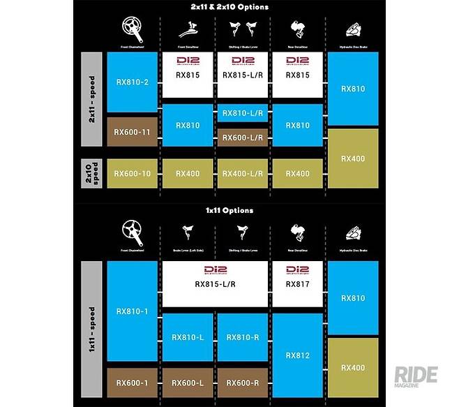 RX800과 RX600 시리즈는 1x11단과 2x11단의 변속 옵션을 제공하는데, 만약 싱글 체인링(40T 또는 42T)과 더블 체인링(48-31T 또는 46-30T) 중 선택을 해야 한다면 필자는 더블 체인링을 선택할 것이다. 왜냐하면 앞 기어 변속의 재미를 포기할 수 없고, FC-RX810-2 더블 체인링 크랭크셋의 경우 17개의 톱니 차이를 두어 넓은 기어 범위를 제공하기 때문이다.