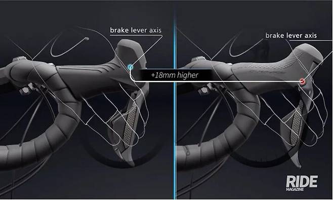 일반적인 로드바이크의 브레이크 레버와 비교하여 GRX의 브레이크 레버 축의 위치를 18mm 더 높게 설계됐다. 이는 지레의 원리에 따라 더욱 안정적이고 강력한 제동력을 제공한다.