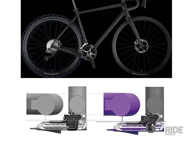 유선형의 디자인으로 인체공학적 요소가 반영된 GRX의 앞변속기는 크랭크셋 체인링과 함께 프레임에서 바깥쪽으로 2.5mm 더 여유 있게 설계됐다. 이는 기존 로드바이크의 앞변속기와 굵은 타이어 조합의 경우에 발생할 수 있었던 간섭을 방지하기 위한 것으로, 최대 42mm의 굵은 타이어를 사용할 수 있도록 상당한 클리어런스를 확보했다.
