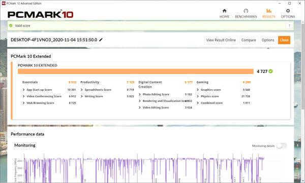 PCMark10 시스템 벤치마크 결과는 전체 점수 4,700점대로 인텔 8코어 프로세서 기준으로 봤을 때 무난한 수준을 기록했다. 인텔 내장 그래픽 외에 쿼드로 P1000 외장 그래픽 카드가 추가된 것이 도움을 준 것으로 생각된다.