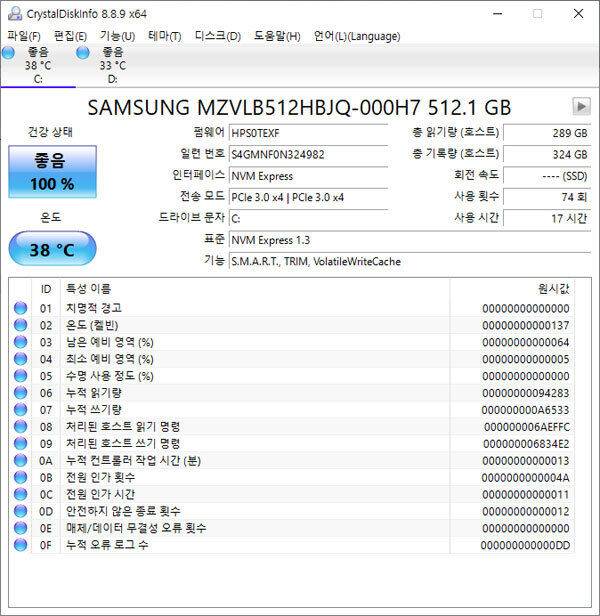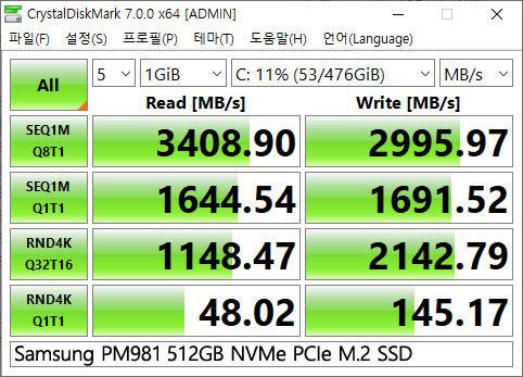 기본 장착된 삼성 PM981 512GB M.2 SSD는 PCIe 3.0 x4 인터페이스의 최대 속도에 가까운 3,400MB/s 이상의 연속 읽기 성능과 3,000MB/s의 연속 쓰기 성능을 제공한다. 씨게이트 1TB SATA HDD는 속도보다는 더 많은 용량과 낸드 쓰기 수명이 존재하는 SSD를 고려해 데이터 안정성을 위한 선택으로 볼 수 있다.