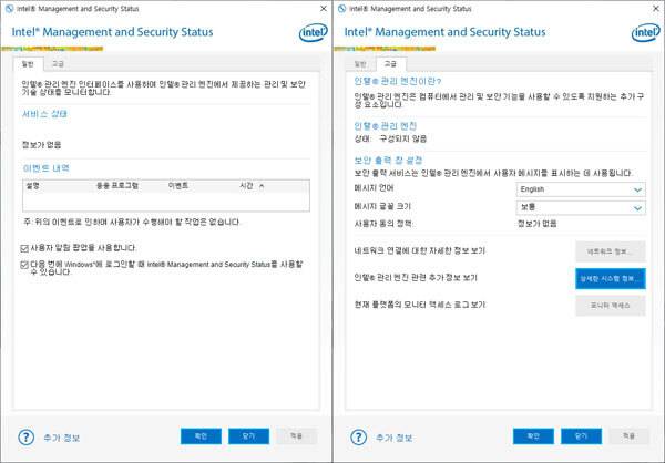 사전 설치된 인텔 관리 및 보안 상태(Intel Management and Security Status)는 윈도우가 실행될 때마다 시작되고, 인텔 액티브 관리 기술, 인텔 표준 관리성 및 인텔 도난 방지 기술이 플랫폼에서 실행되고 있는지 여부를 나타낸다.
