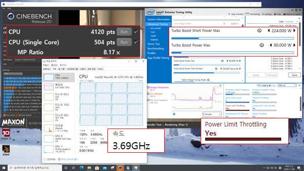 모니터링 및 오버클럭 도구인 인텔 익스트림 튜닝 유틸리티(Intel Extreme Tuning Utility)로 살펴보니 터보 부스트 전력이 CPU 기본 TDP인 80W로 고정된 상태이며 이를 높이면 최대 클럭이 올라가지만 CPU 온도가 급격하게 치솟기 때문에 이번에는 써멀 스로틀링이 걸려 결국 최대 성능을 낼 순 없다.