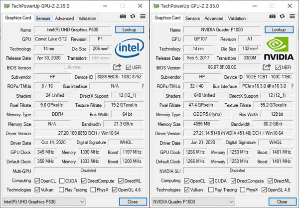 GPU-Z로 그래픽카드 정보를 살펴보면 인텔 제온 W-1270 프로세서의 내장 그래픽 인텔 UHD 그래픽 P630와 LP 타입 외장 그래픽 카드 엔비디아 쿼드로 P1000이 설치된 것을 확인할 수 있다.